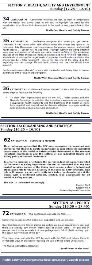 The CWU will work with organisations such as the TUC and the Hazards Campaign to maintain the importance emphasis on improving occupational health standards and the treatment of Ill health at work both physical and mental and to develop effective strategies working with Unions to ensure employers compliance.