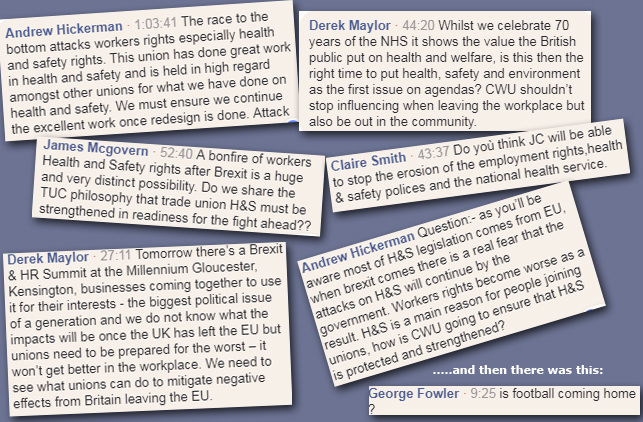Amongst the many relevant questions being asked via the comments box to the right of the ‘conversation’ taking place were those about the lack of T&FS interaction by the Union, the situation over Royal Mail 25 hours contracts, why the Union’s membership is decreasing, the effects of Brexit on the NHS; and how the Union will respond to the attacks on Health & Safety at work and worker’s rights which will continue at some greater pace after Brexit.