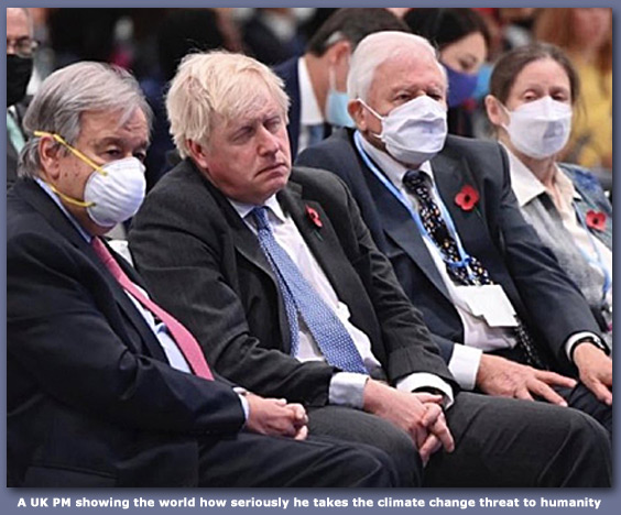 Johnson's empty words on climate change, proven by his lack of action on sewage pollution of UK rivers and coastline, on minimal support for Green Alternatives in real terms and the lowering of standards designed to protect wildlife, our Air quality, and our environment and food from chemical pollution and Bee killing pesticides; and last but not least his Government's whole handling of the Coronavirus pandemic in the UK; can be summed up by this one snapshot of Boris Johnson at COP 26. He sleeps as the UK and the World continue to permanently destroy eco-systems, rain forests, our oceans and wildlife across the planet!