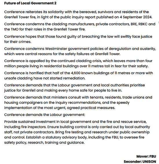 Measures outlined in the motion include investing in local government and fire and rescue services, including fire inspectors; ending the privatisation of building control, fire testing and research; and establishing a statutory advisory body, including the FBU, to oversee fire safety policy, research, training and guidance.