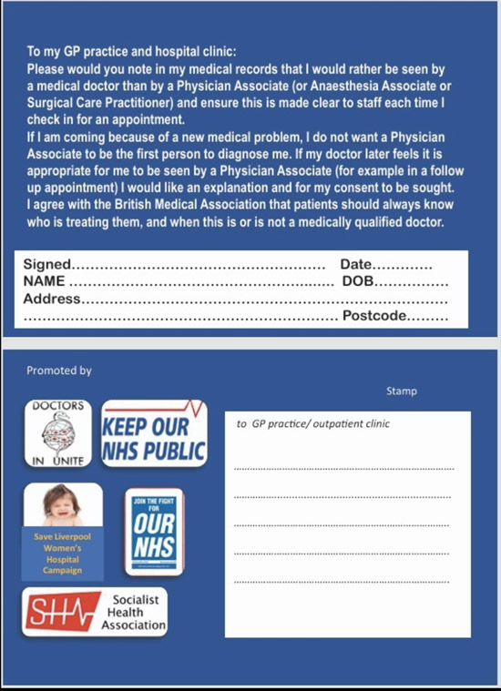 If you don't want this to happen, then this can be used to highlight in your medical notes that you only want to see a fully trained and accredited GP or Hospital Doctor. Your life may depend upon it, as there has already been at least 2 deaths as a result of PAs administering prescriptions or wrongly diagnosing patients.