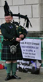 This theme was carried on when PCS National Vice President Paula Brown spoke of the attacks upon the HSE which she said will lead to the total decimation of the organisation, with major losses of experienced staff, inspectors and funding to resource the service appropriately. She outlined how the HSE had lost the ability to provide telephone support and advice both to employers and employees, and how it had been stopped from doing any pro-active inspections in workplaces such as Docks and newly labeled 'low risk' workplaces including some classes of industrial sites. In closing she said: "PCS is defending the jobs and services of our members working at the Health and Safety Executive (HSE) from government attacks through spending cuts, deregulation and myth-peddling. A number of speakers had criticised not only the present government but also the Labour government, reminding people that since 1997 staffing of the HSE and funding had also been cut, with the resultant lack of workplace inspections it was able to undertake. The memorial service at Liverpool's Mann Island corner of The Strand, culminated with the lone piper playing as wreaths where laid by organisations and individuals to the tens of thousand of workers who have been killed as a result of employer's neglect of their basic human right to be healthy and safe in their workplace. Source pics & text: Chris Ingram, Unionsafety / Hazards / PCS / Unite / UNISON / CWU Read Dawn Adams story of the death of her son here The stories of other vicitims of workplace death can be found here |