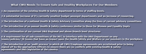 1. H&S Forums are to be abolished and replaced with Regional Health & Safety Committees which are no longer autonomous, but answer to the Regional Committees. 2. Only ONE member from the newly formed Regional H&S Committees can attend their Regional Committee Meetings. and will do so in the capacity of the post of Health & Safety Lead. 3. This post will be for the first time, an elected post by the Branches in the Region and on the basis of one single Union constituency only! This will mean the loss of expertise and experience and the domination of one constituency over the other! 4. Regional H&S Committees will NOT be allowed to submit motions to annual conference, thereby ending year’s of custom and practice where the H&S Forums could submit motions on Health & Safety issues. Indeed if it were not for these Forums being able to do so, there would never have been a Health & Safety policy making section at Annual Conference. 5. In the new structure, ONLY Regional Committees can submit motions to conference, with the exception of the Retired Members Committee, The Women’s Committee, 6. The Regional Committees will be responsible for supporting the CWU's new strategies listed: Organising and Recruitment Strategy, Education, Learning and Training Strategy– NO mention whatsoever of a Health & Safety Strategy! 7. There will be NO funding streams for Health & Safety Committees! 8. NEC Health & Safety sub-committee and all others to be ‘streamlined’ into the NEC! In effect, the NEC H&S Sub-committee could be abolished! So now the CWU could well be the ONLY Trade Union without a national Health & Safety Strategy! The specific health & safety needs of the numerous and different industry based jobs will no longer be represented at Regional Committees, as only ONE H&S Lead will have to take care of the needs of both member’s working in the T&FS and the Postal industries.
