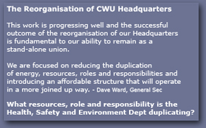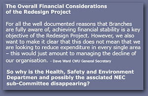 "Our General Secretary needs to remember that the CWU have mentioned many times that CWU members should be out in their communities; apart from the usual political activism such as Labour and Cooperative Parties membership and activism as councillors etc. we are. Safety Reps are active in their local communities with these examples in the North West alone: * a magistrate looking after safety within the community; They are all pushing CWU/trade union policy and ethos at every opportunity. This is reflected around the country of course and the NW is not pretentious enough to think we are the only ones who do this." He concluded: "This community participation will be lost if the Health, Safety & Environment Dept and organisation is binned – not saying we will be prevented from participation but will lose any inclination to do so when our own union do not prioritise H, S & E for members and even demonstrate little interest!" However, examining the NEC’s Policy Documents on RE-Design which will be debated at the CWU’s special conference in November; it clearly confirms that the CWU H&S Community and this website were correct from the outset in it’s portrayal of Re-Design being used as a vehicle with which to abolish existing Health and Safety Structures, and to remove the stand alone Health, Safety, and Environment Dept. In a document which as with it’s predecessor, hardly mentions Health & Safety, and certainly not in a positive light when it did in the only paragraph to do so, once again confines mention of Health & Safety to the section on Re-Design of the Regional structures of the CWU; and again then scantily on a section concerning Annual Conference and the submitting of motions to conference.
