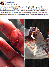 But it is not just delivery workers who suffer injuries from dog attacks, as this recent posting on Twitter from Angela Raynor MP whose husband suffered injuries to his fingers when posting leaflets through constituents doors.