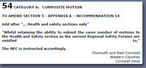 We hope and envisage that safety committees will be the main instigators of the motions taken to conference under this rule and will raise the profile of health, safety and the environment amongst branches and national bodies alike.