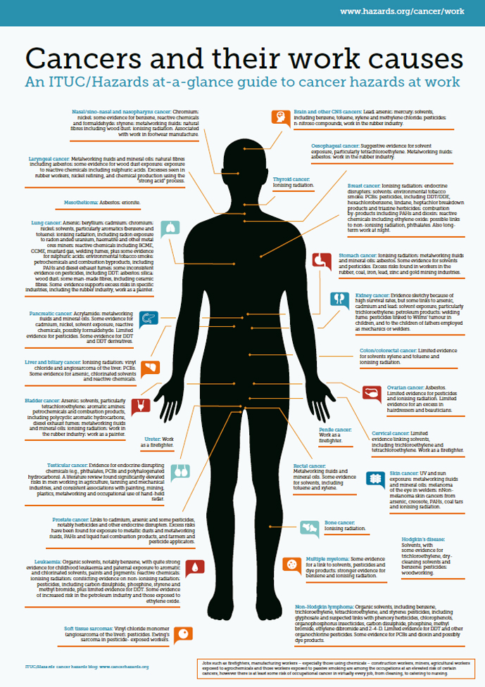 Hazards Cancer Causing Workplace Substances Info-Graphic For IWMD 2019 Hazards Campaign have produced this excellent information graphic detailing the workplace causes of cancer which can be downloaded and printed. The theme of this year's International Worker's Memorial Day is: 'Taking control - Removing dangerous substances from work'The PDF document below is handy for noticeboards, home mailers and websites too. You can download it from the Unionsafety E-Library here, or by clicking on the pic above.