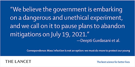 Today (8th July) following the publication of a letter denouncing the Government's intention to remove all Covid-19 restrictions on 19th July; a press conference was held in London to alert the public to the serious risk of infections spiking and specifically affecting the young and non-vaccinated. The over 100 signatories to the letter published on The Lancet website, make it abundantly clear that this decision by Boris Johnson is so grave, it will see increased deaths and long-term illnesses as well as 'Long-Covid'. Calling the decision to open up society from all restrictions 'dangerous and premature', they state: " As the third wave of the pandemic takes hold across England, the UK Government plans to further re-open the nation. Implicit in this decision is the acceptance that infections will surge, but that this does not matter because vaccines have “broken the link between infection and mortality”. On July 19, 2021—branded as Freedom Day—almost all restrictions are set to end. We believe this decision is dangerous and premature. " The letter continues: "An end to the pandemic through population immunity requires enough of the population to be immune to prevent exponential growth of SARS-CoV-2. Population immunity is unlikely to be achieved without much higher levels of vaccination than can be reasonably expected by July 19, 2021. Proportionate mitigations will be needed to avoid hundreds of thousands of new infections, until many more are vaccinated." The scientists argue that the Government's aim of attaining immunity via natural means (herd immunity) and therefore opening up the country, 'means that immunity will be achieved by vaccination for some people but by natural infection for others (predominantly the young)." "The link between infection and death might have been weakened, but it has not been broken, and infection can still cause substantial morbidity in both acute and long-term illness. We have previously pointed to the dangers of relying on immunity by natural infection, ....." At the dispatch box in the House of Commons, the Health Secretary stated on 6th July, that daily cases could reach over 100,000 per day during the summer as a result of the lifting of health protection methods on 19th July; including the wearing of face masks! The letter goes on to list 5 reasons why the 100 plus scientists, signatories to the letter; warn the Government against lifting all restrictions at this stage of the pandemic in the UK. Briefly they are: 1. unmitigated transmission will disproportionately affect unvaccinated children and young people who have already suffered greatly. 2. high rates of transmission in schools and in children will lead to significant educational disruption, a problem not addressed by abandoning isolation of exposed children (which is done on the basis of imperfect daily rapid tests). The root cause of educational disruption is transmission, not isolation. Strict mitigations in schools alongside measures to keep community transmission low and eventual vaccination of children will ensure children can remain in schools safely. 3. preliminary modelling data suggest the government's strategy provides fertile ground for the emergence of vaccine-resistant variants. This would place all at risk, including those already vaccinated, within the UK and globally. 4. this strategy will have a significant impact on health services and exhausted health-care staff who have not yet recovered from previous infection waves. The link between cases and hospital admissions has not been broken, .... 5. as deprived communities are more exposed to and more at risk from COVID-19, these policies will continue to disproportionately affect the most vulnerable and marginalised, deepening inequalities. The public can sign the letter too - at the John Snow Memorandum website here The John Snow Memorandum is the work of a group of international researchers with expertise spanning public health, epidemiology, medicine, paediatrics, sociology, virology, infectious disease, health systems, psychology, psychiatry, health policy, and mathematical modelling. We felt moved to deliver a clear and simple message about how best to manage the COVID-19 pandemic. The Press Conference can be watched below: (wait for a few seconds for logo to fade from vision)