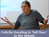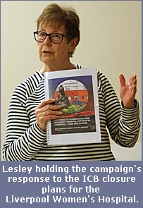 Lesley Mahmood, also a founder member of the SLWH Campaign, was up next in the easier role of putting forward the campaign against closure of the Liverpool Women's Hospital, case. Indeed, she commented how strange it felt to hear Felicity try to act as a member of the ICB and putting their case.