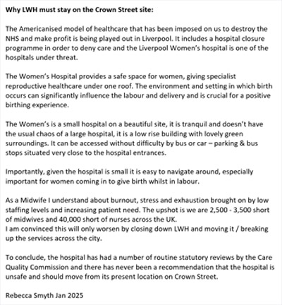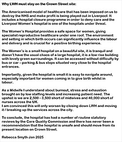 Leslie concluded, by reading out a letter from a retired mid-wife and midwife lecturer who had worked at the Crown Street site and makes it perfectly clear that the closure and the dispersal of maternity services in Liverpool is an exercise in healthcare denial and that there has NEVER been a report from the Care Quality Commission or any other healthcare body suggesting that the Crown Street site is a danger to patients.