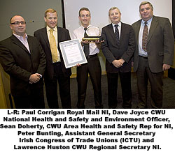 At the presentation in Belfast, during European Health and Safety Week, CWU National Health and Safety Officer Dave Joyce who nominated Sean said "I am delighted that Sean Doherty, a CWU Health and Safety Representative has won the HSE(NI)/ICTU Safety Representatives Award and I'm pleased to add my personal congratulations as well as to thank Sean for the work he does as a Health and Safety Rep on behalf of CWU members in Northern Ireland."