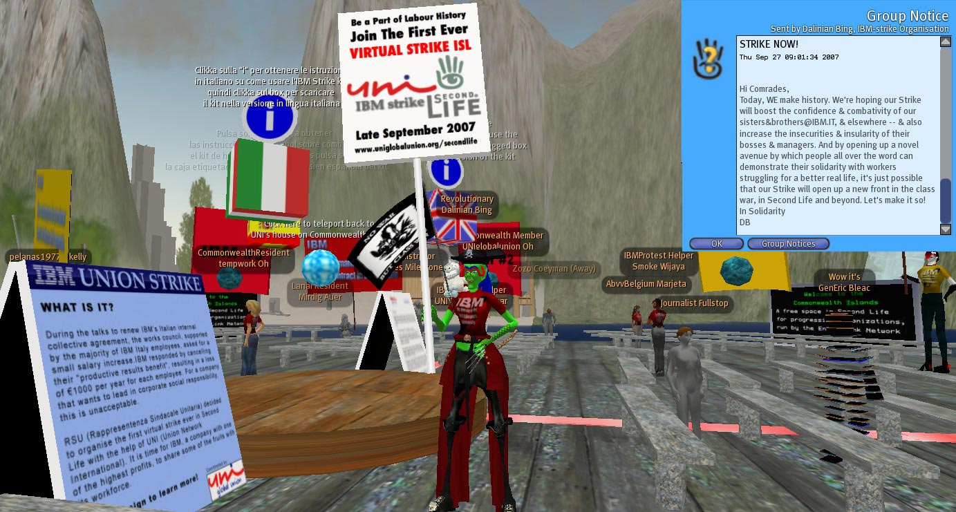 The Second Life protest was reported all over SL and the web, and coupled with the threat of real world strikes to follow, IBM Italy agreed to go to negotiation with the union, and gave the workers back their pay. This was only one more union campaign of the type that are going on every day around the globe, but the significance of Second Life in the dispute was something totally new.” Further information of the effects of the strike that was instrumental in success for the trade unions involved was issued in the form of this UNI press release: One month after a virtual protest staged in Second Life with almost 2’000 avatars demonstrating on IBM islands, a new contract with IBM Italy has been signed. You can view a short 6 min video of the campaign logistics and day of action below: