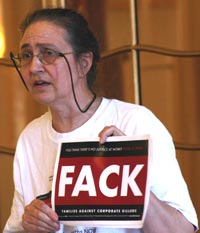 "FACK is a group of families angry and frustrated as employers seem to be getting away with murder. The pressure group intends to give a voice to those who pay the price for employers negligence - the people killed and their families - to equal the voice of the employers and business in shaping policy on health and safety." Reminding the conference that The Corporate Manslaughter Bill passed by the government in .July 2007 IS NOT an effective law when it comes to the death of workers at work, she listed the following amongst the aims of FACK: